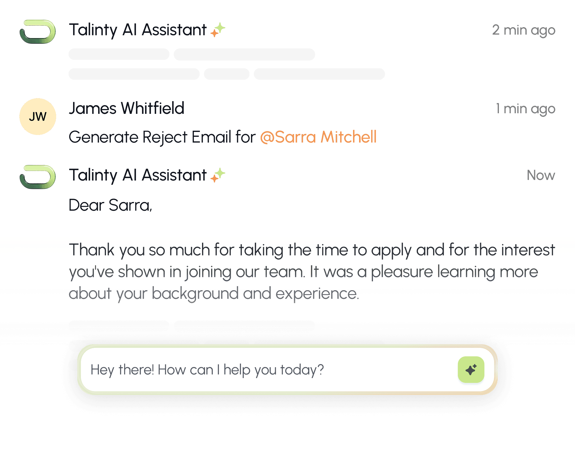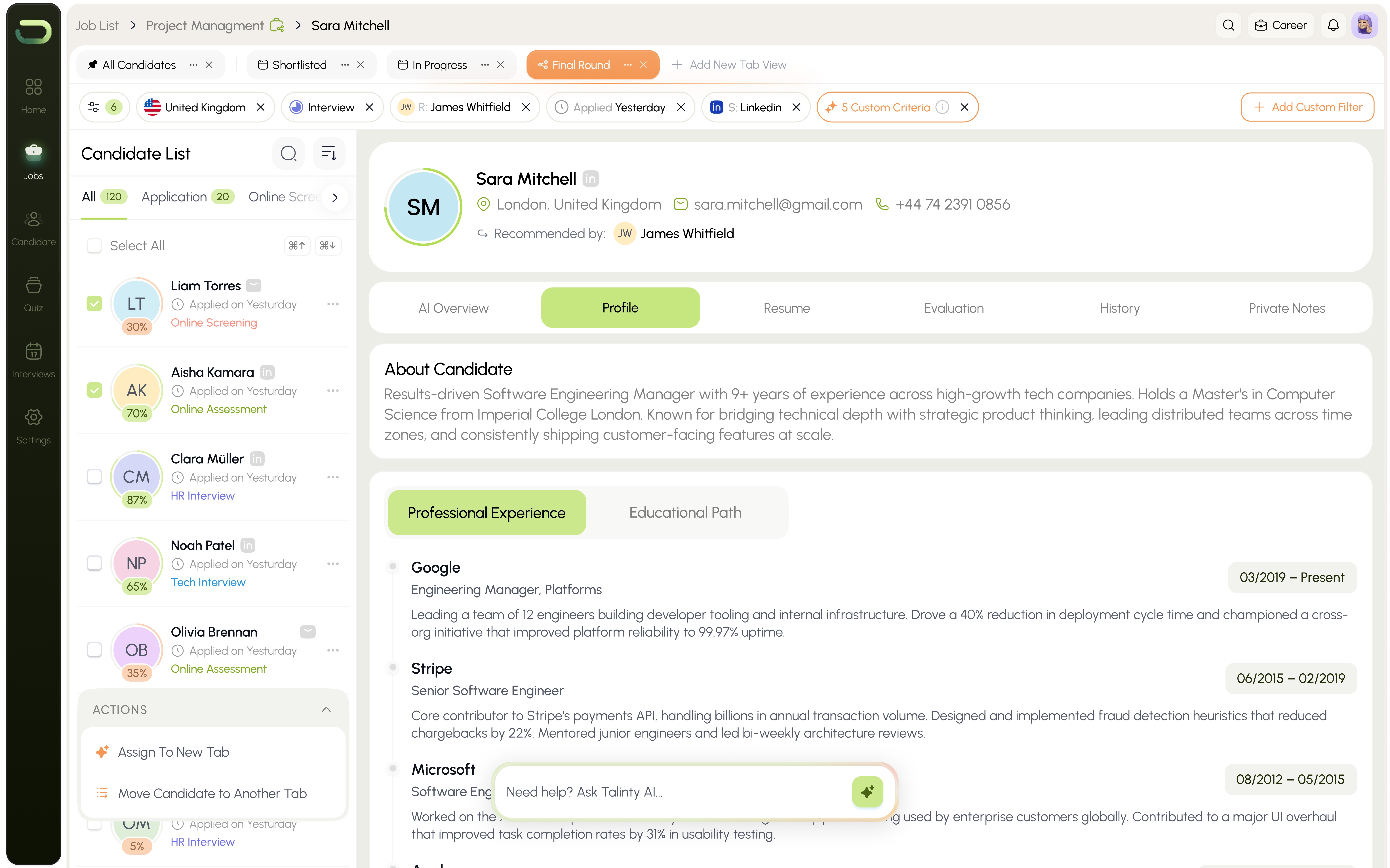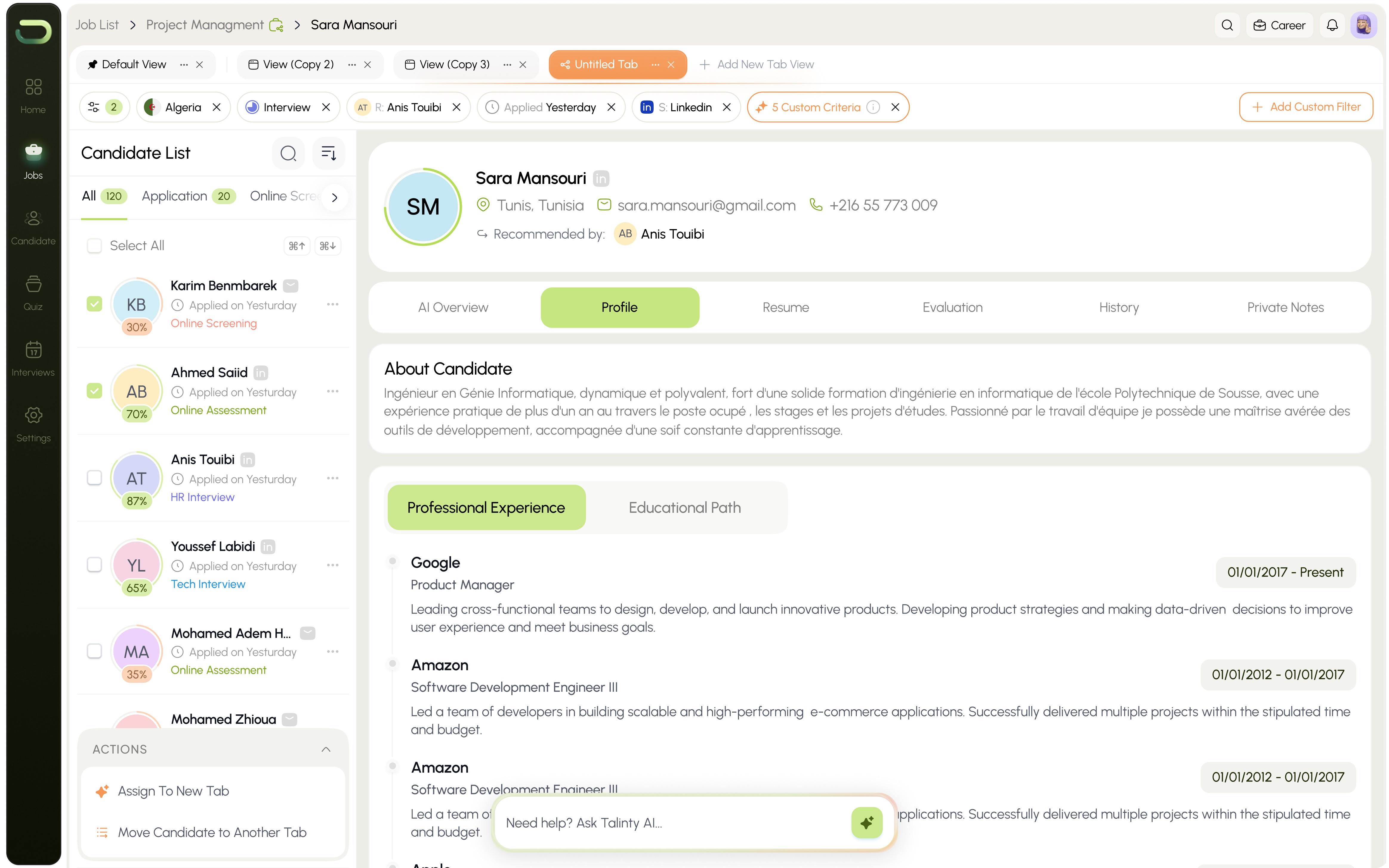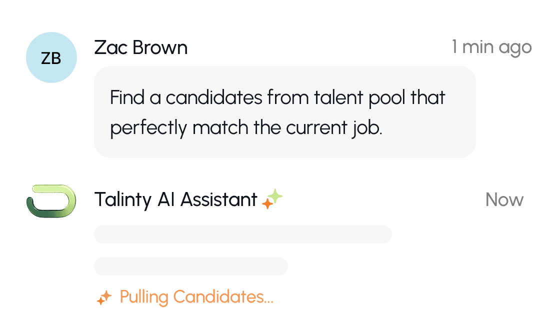 Ask TalintyAI anything from any screen. Summarize candidates, draft emails, suggest criteria, compare shortlists. The AI understands where you are and responds accordingly.